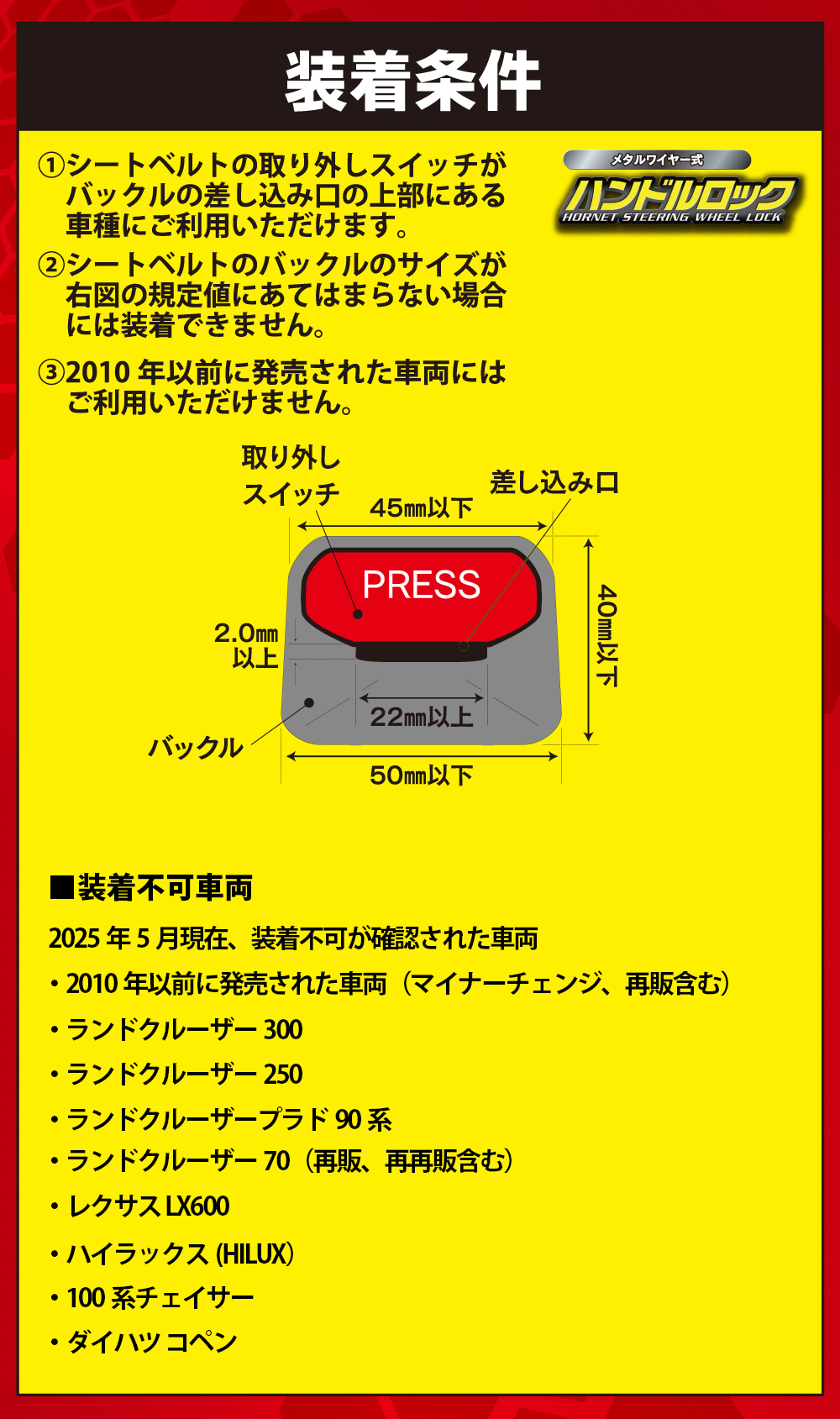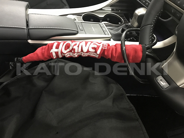 硬いのに柔軟性のあるメタルワイヤーを採用したハンドルロックです。簡単には切断できないため高い防犯効果が期待できます。ロック方法は、ハンドルにワイヤーを通して、シートベルトバックルに差し込むだけで簡単です。またピッキングされにくい内溝タイプの専用キーが3本付属されています。軽量でコンパクトなため、収納に困りません。グローブボックスの中に収納できます。付属のHORNETロゴ入りクリーニングクロスは車内清掃や本製品と車両のステアリングが接触する部分の保護としてもご利用いただけます。