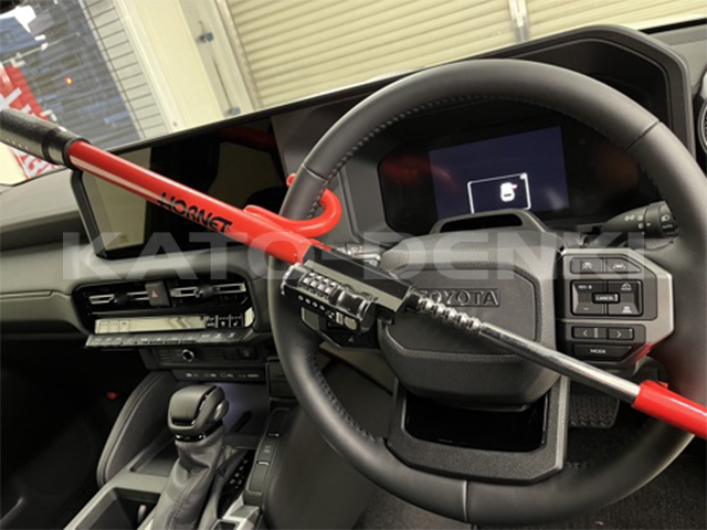 4連青色LEDのスキャナーで夜間も防犯していることをアピールできる抑止効果抜群のハンドルロックです。4桁の暗証コード(キー番号)を任意に登録できるダイヤル式を採用しました。また、シングルロック方式と21段階で長さを調整できるため幅広い車種に対応しています。SUV、ミニバン、トラックにも対応しています。専用キーを持たずにご利用いただけるため、商用車など複数車両の防犯管理に最適です。