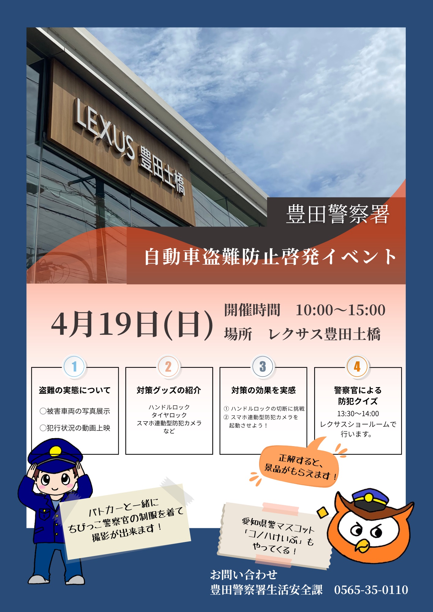 豊田警察署様主催の自動車盗難防止啓発イベントがレクサス豊田土橋店にて開催されます。